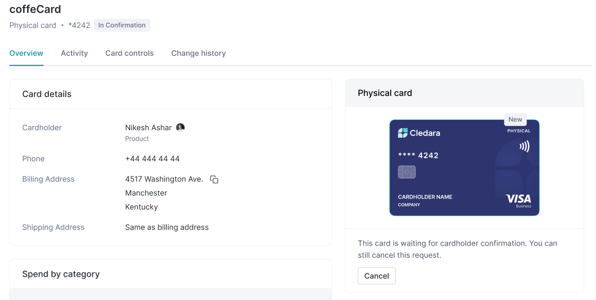 Once a card is ordered in Cledara Spend, the cardholder will need to confirm the card order before it is formally issued.