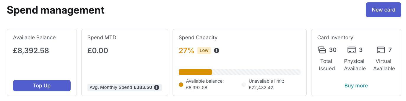 As your Spend control centre, this tab allows you to monitor your company cards and expenses at one quick glance, expanding or restricting budgets whenever necessary.