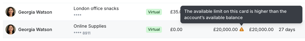 If your Spend available balance drops below any of your Spend card limits, we will notify you with a warning. This indicates that while a card has a set limit, transactions may still be declined if the Spend account lacks sufficient funds to cover them: