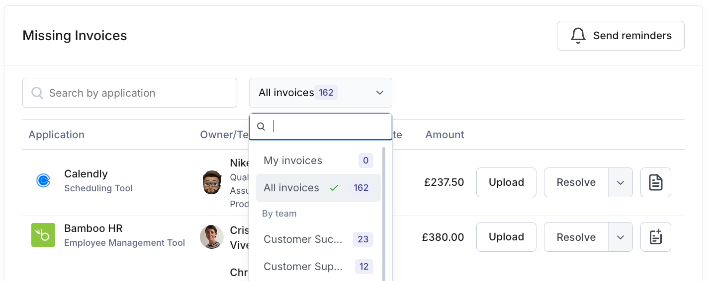 - Filter missing invoices by team (SaaS Admins and SaaS Finance only)